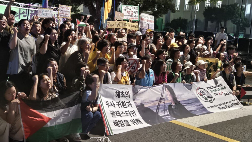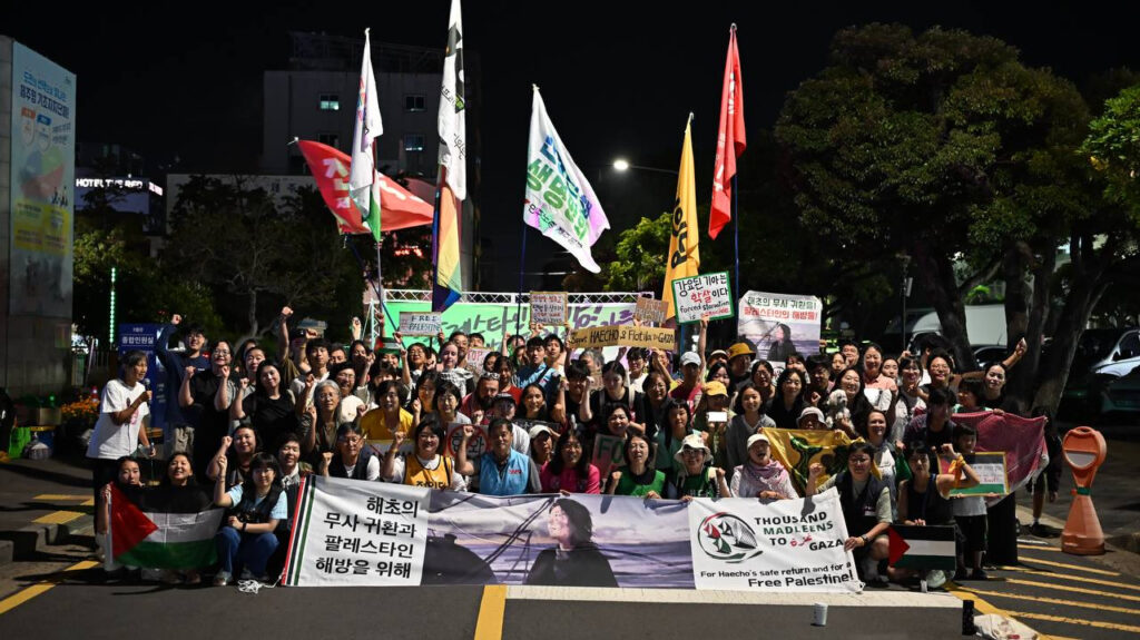 On Wed., Oct. 8, at 11:40 AM, Haecho’s boat, the ‘Alaa Al-Najjar’ was seized. Around the same time, all nine ships of the ‘Thousand Madleens to Gaza’ humanitarian flotilla were seized by Israeli forces. All activists, journalists, and medical personnel aboard the flotilla were arrested and detained in an Israeli desert security prison. Two days later, on Oct. 10, Haecho was released under voluntary deportation and, as she said, she is returning to us. However, our demand has been not only Haecho’s release but also the safe and swift release of all activists from the flotilla.