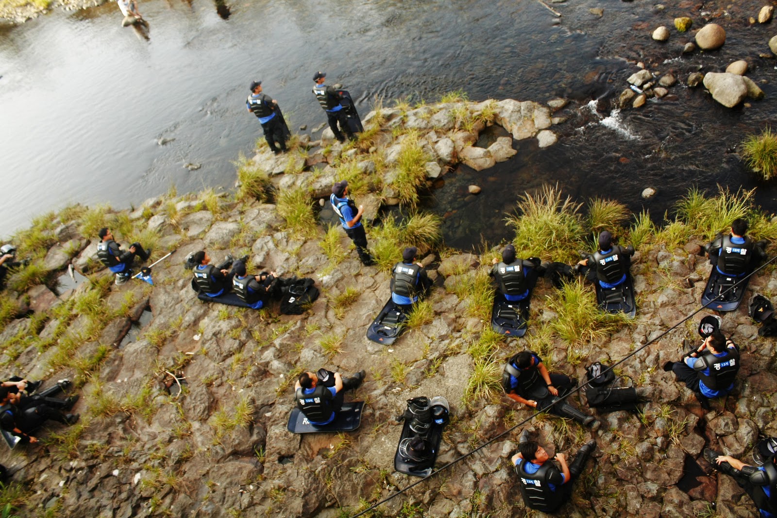 江汀村園遊會當天警力擴展至江汀川,民眾在警察環伺下戲水