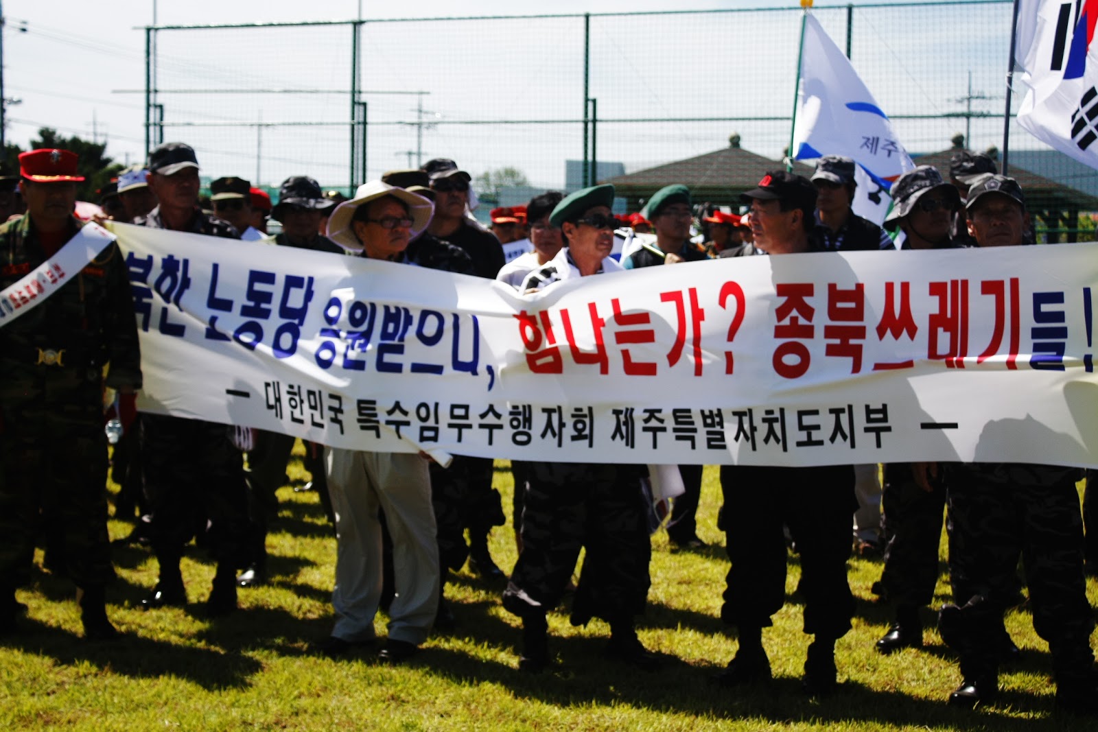 退休軍人在江汀村的遊行,手上拿著的旗幟上寫著:從北韓的垃圾